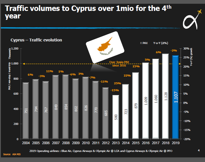 Εδώ και λίγο καιρό η εταιρεία συνδέει την Αθήνα με την Πάφο με τρεις εβδομαδιαίες πτήσεις. Με τη νέα σύνδεση, η Cyprus ενισχύει ακόμα περισσότερο την επιτυχημένη παρουσία της στο Διεθνή Αερολιμένα Αθηνών, έχοντας μεταφέρει συνολικά προς / από την Αθήνα το 2019, 112 χιλιάδες επιβάτες. Συνολικά, ο όγκος της κίνησης στο Ελ. Βενιζέλος προς την Κύπρο ξεπέρασε το 2019 για τέταρτη συνεχή χρονιά το 1 εκατομμύριο φθάνοντας πέρυσι το 1,1 εκατ., αν και με οριακή πτώση 2% έναντι του 2018.