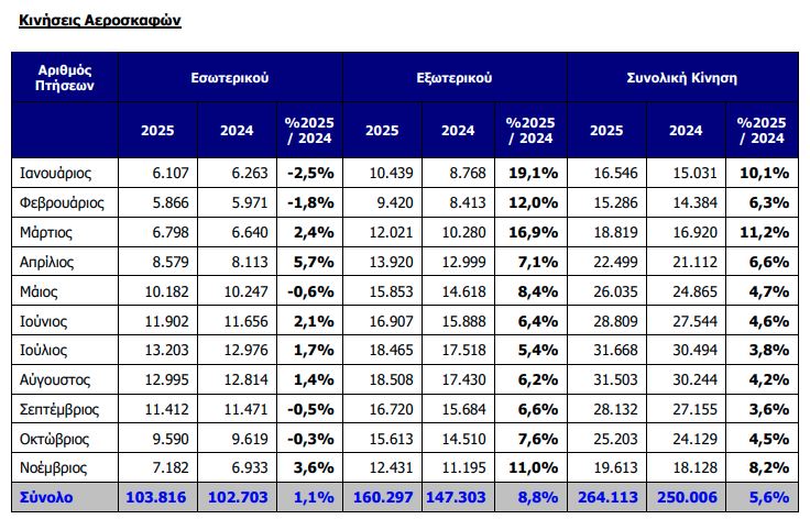 Ο αριθμός των πτήσεων στον Διεθνή Αερολιμένα Αθηνών κατά τη διάρκεια των έντεκα πρώτων μηνών του 2025 ανήλθε σε 264.113, καταγράφοντας αύξηση της τάξης του 5,6% σε σχέση με το 2024. Οι πτήσεις εσωτερικού παρουσίασαν άνοδο της τάξης του 1,1%, ενώ οι διεθνείς πτήσεις σημείωσαν αύξηση κατά 8,8% σε σχέση με την αντίστοιχη περίοδο του 2024.