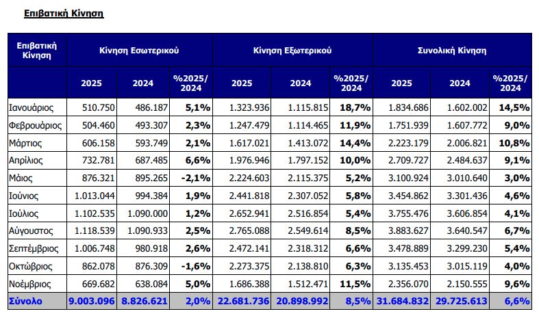 Η επιβατική κίνηση του αεροδρομίου της Αθήνας κατά τη διάρκεια του Νοεμβρίου 2025 ανήλθε σε 2,36 εκατ., αυξημένη κατά 9,6% σε σύγκριση με τον Νοέμβριο του 2024, σύμφωνα με τα προκαταρκτικά στοιχεία. Τόσο η εγχώρια, όσο και η διεθνής επιβατική κίνηση παρουσίασαν άνοδο, υπερβαίνοντας τα επίπεδα του 2024 κατά 5,0% και 11,5% αντίστοιχα. Συνολικά, κατά τους πρώτους έντεκα μήνες του έτους, η κίνηση του αεροδρομίου έφθασε τους 31,68 εκ. επιβάτες, σημειώνοντας άνοδο της τάξης του 6,6%. Η επιβατική κίνηση, τόσο του εσωτερικού όσο και του εξωτερικού, παρουσίασε αύξηση κατά 2,0% και 8,5% αντίστοιχα.