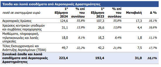 κατά 16,1% σε σχέση με το 1ο εξάμηνο του προηγούμενου έτους. Η εν λόγω αύξηση οφείλεται κατά κύριο λόγο στην αύξηση της επιβατικής κίνησης κατά 16,0% η οποία συντέλεσε στην αύξηση των εσόδων από τις Αεροπορικές Χρεώσεις, ενώ το επίπεδο των Αεροπορικών Χρεώσεων παρέμεινε σταθερό.