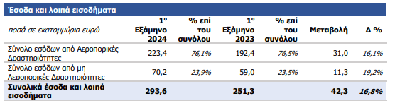 O ακόλουθος πίνακας παρουσιάζει την ανάλυση της Κατάστασης Αποτελεσμάτων Χρήσης σε Αεροπορικές και Μη Αεροπορικές Δραστηριότητες για το 1ο εξάμηνο του 2024: