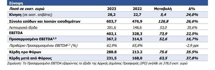 • Το Προσαρμοσμένο EBITDA2,3 ανήλθε σε 367,2 εκατ. ευρώ, σημειώνοντας αύξηση 16,7% σε σύγκριση με το 2022, ενώ το προσαρμοσμένο περιθώριο EBITDA ανήλθε σε 62,9%.