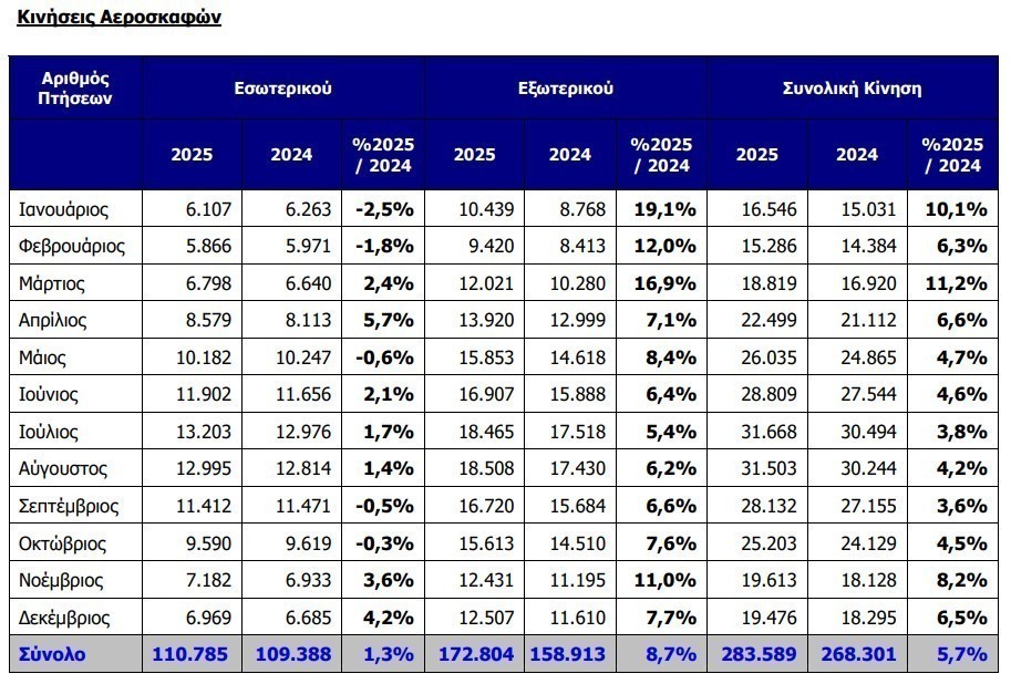 Η επιβατική κίνηση του αεροδρομίου της Αθήνας (ΔΑΑ) κατά τη διάρκεια του Δεκεμβρίου 2025 ανήλθε σε 2,31 εκατ., αυξημένη κατά 8,4% σε σύγκριση με τον Δεκέμβριο του 2024. Τόσο η εγχώρια, όσο και η διεθνής επιβατική κίνηση παρουσίασαν άνοδο, υπερβαίνοντας τα επίπεδα του 2024 κατά 5,5% και 9,6% αντίστοιχα.