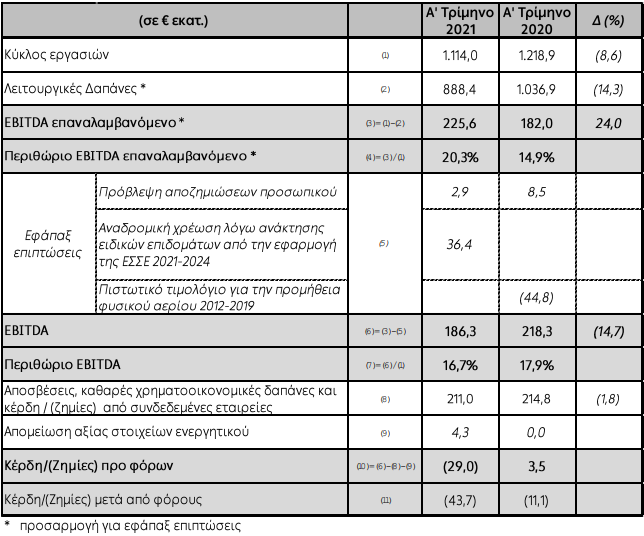 Ο κύκλος εργασιών, μειώθηκε το α’ τρίμηνο 2021 κατά €104,9 εκατ. ή 8,6% λόγω του μειωμένου όγκου πωλήσεων κατά 866 GWh ή 10,4%, συνεπεία της απώλειας μεριδίου αγοράς (5,4 ποσοστιαίες μονάδες) καθώς και της πτώσης της εγχώριας ζήτησης (κατά 5,6%).
