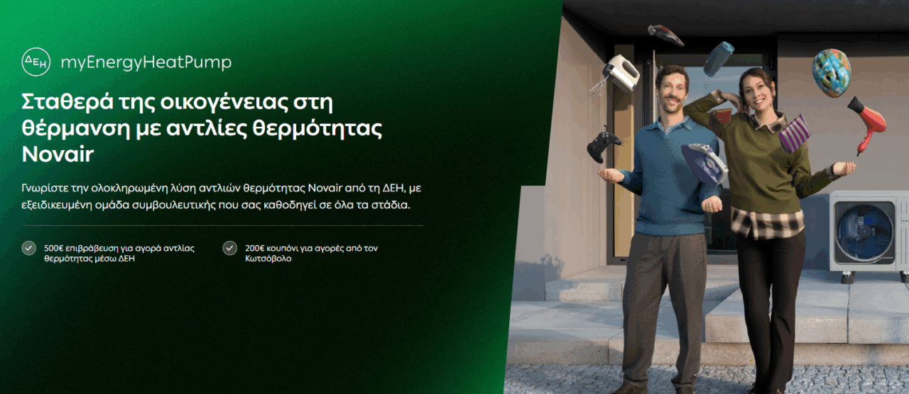 Η ΔΕΗ φέρνει ολοκληρωμένες λύσεις που συνδυάζουν υψηλή ενεργειακή απόδοση και σημαντική εξοικονόμηση κόστους, ενώ παράλληλα συμβάλλουν ουσιαστικά στην προστασία του περιβάλλοντος. Το ΔΕΗ myEnergy HeatPump αποτελεί ολοκληρωμένη λύση για την εγκατάσταση αντλιών θερμότητας Novair, που ανταποκρίνονται πλήρως στις σύγχρονες ανάγκες των νοικοκυριών, προσφέροντας σταθερότητα, άνεση και ενεργειακή αυτονομία όλο τον χρόνο.