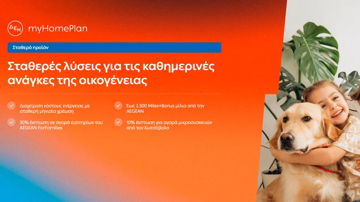 Η ΔΕΗ παρουσιάζει το νέο προϊόν ΔΕΗ myHome Plan, σχεδιασμένο για τις ανάγκες των οικογενειών και τις σύγχρονες ενεργειακές ανάγκες των πελατών. Το νέο προϊόν προσφέρει σταθερή τιμή χρέωσης, εξασφαλίζοντας στην οικογένεια τη δυνατότητα να διατηρεί σταθερό το κόστος ενέργειας κάθε μήνα με τη βοήθεια του ΔΕΗ myEnergy Coach, του ψηφιακού συμβούλου της ΔΕΗ.