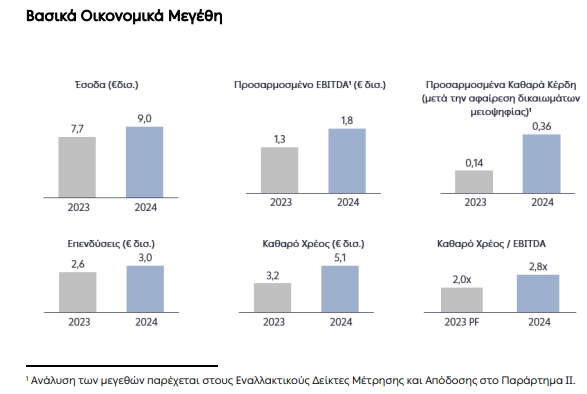 Ισχυρή λειτουργική κερδοφορία για το 2024 με τα προσαρμοσμένα κέρδη προ τόκων, φόρων και αποσβέσεων (EBITDA) να διαμορφώνονται σε €1,8 δισ., αυξημένα κατά 41% σε σχέση με το 2023. Στην βελτίωση αυτή, συνέβαλε η αυξημένη συνεισφορά των δραστηριοτήτων στην Ελλάδα, τόσο της Διανομής όσο και αυτή της παραγωγής και εμπορίας ηλεκτρικής ενέργειας, καθώς και η ενοποίηση των αποτελεσμάτων της Ρουμανίας για ολόκληρο το έτος σε σχέση με το 2023 και επιπλέον η προσθήκη της Κωτσόβολος στην Ελλάδα.