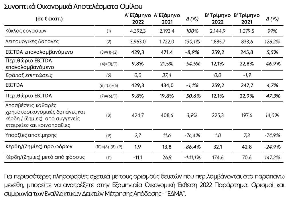 Παρά τη μεγάλη αύξηση των λειτουργικών δαπανών, και κυρίως των δαπανών για αγορές ενέργειας και για φυσικό αέριο, η οποία ουσιαστικά οφείλεται στις εξαιρετικά αυξημένες τιμές φυσικού αερίου που ωθούν ανοδικά και τις τιμές στην χονδρεμπορική αγορά, η λειτουργική κερδοφορία του Ομίλου, σύμφωνα με τη διοίκηση, επέδειξε ανθεκτικότητα με τα κέρδη προ τόκων, φόρων και αποσβέσεων (EBITDA) σε επαναλαμβανόμενη βάση να διαμορφώνονται σε €429,3 εκατ. το α’ εξάμηνο 2022, παρουσιάζοντας μείωση €42,1 εκατ. (-8,9%) σε σχέση με την αντίστοιχη περυσινή περίοδο, με το αντίστοιχο περιθώριο να διαμορφώνεται σε 9,8%.
