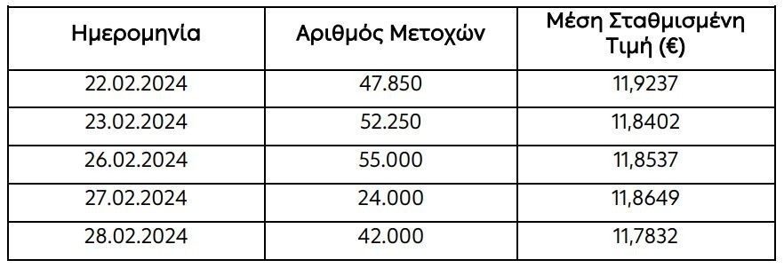 Η Δημόσια Επιχείρηση Ηλεκτρισμού Ανώνυμη Εταιρεία (η «ΔΕΗ»), ανακοινώνει ότι, στο πλαίσιο του προγράμματος επαναγοράς μέχρι και 36.344.000 μετοχών εκδόσεώς της (οι «Ίδιες Μετοχές»), κατά το χρονικό διάστημα από 22.02.2024 μέχρι και 28.02.2024, αγόρασε μέσω συναλλαγών στο Χρηματιστήριο Αθηνών συνολικά 221.100 Ίδιες Μετοχές, ως εξής: