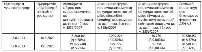 Ως εκ τούτου, η συνολική συμμετοχή της Goldman Sachs Group, Inc. στα δικαιώματα ψήφου της ΔΕΗ Α.Ε., ήτοι, το άθροισμα των δικαιωμάτων ψήφου που ενσωματώνονται σε μετοχές, των δικαιωμάτων ψήφου που προέρχονται από χρηματοπιστωτικά μέσα (Securities Lending) και των δικαιωμάτων ψήφου που προέρχονται από χρηματοπιστωτικά μέσα με αντίστοιχη οικονομική επίπτωση (Swaps) διαμορφώθηκε στις 15.8.2023 σε 20.510.178 (ή 5,37%) από 20.999.666 (ή 5,50%) στις 11.8.2023.