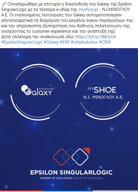 Ολοκληρώθηκε με επιτυχία η διασύνδεση του Galaxy της Epsilon SingularLogic με τα τέσσερα e-shop της myshoe – Ν.Ι.ΜΙΝΟΓΛΟΥ Α.Ε., για την αποτελεσματική διαχείριση του μεγάλου όγκου παραγγελιών της και την απρόσκοπτη εξυπηρέτηση του διεθνούς πελατολογίου της.