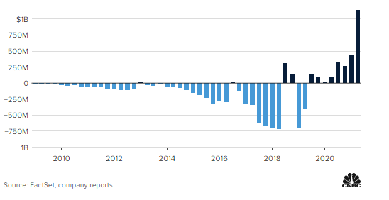 Άλμα άνω του 2% σημείωσε η μετοχή της Tesla μετά την ανακοίνωση των αποτελεσμάτων β’ τριμήνου, καθώς τα καθαρά κέρδη της ξεπέρασαν για πρώτη φορά το 1, δισ. δολ. Συγκεκριμένα, διαμορφώθηκαν σε 1,14 δισ. και ουσιαστικά δεκαπλασιάστηκαν μέσα σε έναν χρόνο από τα 104 εκατ. δολ. το β’ τρίμηνο του 2020.