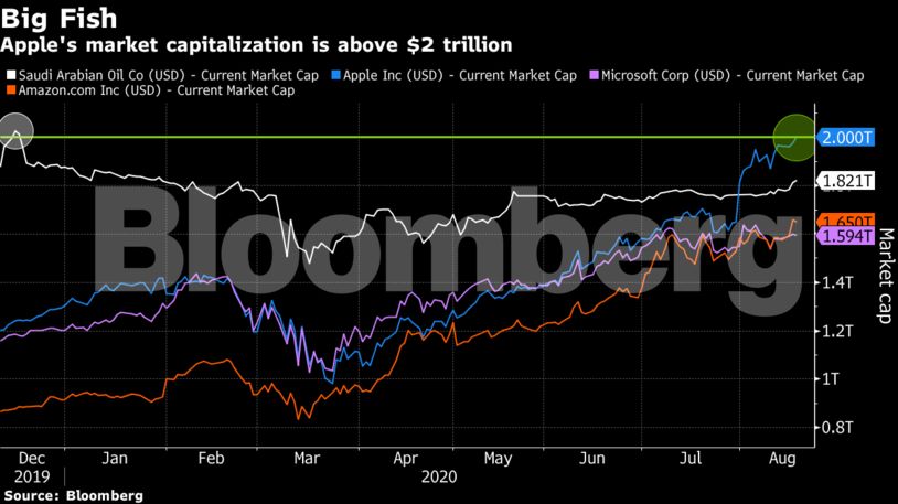 Ιστορία έγραψε η Apple για άλλη μία φορά, καθώς κατά τη διάρκεια της σημερινής συνεδρίασης η μετοχή της κατέγραφε κέρδη της τάξεως του 1,4% φέρνοντας τη στιγμή εκείνη την κεφαλαιοποίησή της πάνω από τα 2 τρισ. δολάρια για πρώτη φορά στην ιστορία της. Ωστόσο το ορόσημο αυτό δεν είναι η πρώτη εταιρεία που το σπάει καθώς τον περασμένο Δεκέμβριο ο πετρελαϊκός κολοσσός Saudi Aramco επίσης στιγμιαία έσπασε το φράγμα των 2 τρισ. δολαρίων, εντούτοις έκτοτε η μετοχή της έχει παραδώσει κάποια από τα κέρδη φέρνοντας την κεφαλαιοποίηση στο 1,8 τρισ. δολάρια.