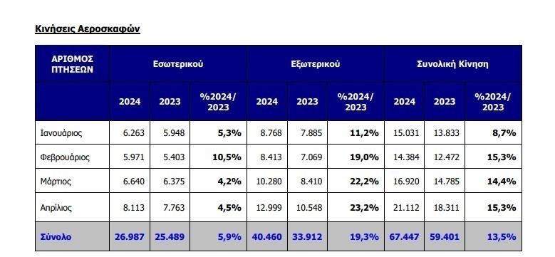 Ο αριθμός των πτήσεων στον Διεθνή Αερολιμένα Αθηνών κατά τη διάρκεια των τεσσάρων πρώτων μηνών του 2024 ανήλθε σε 67.447, καταγράφοντας αύξηση της τάξης του 13,5% σε σχέση με την αντίστοιχη περίοδο του 2023. Τόσο οι πτήσεις εσωτερικού όσο και οι διεθνείς πτήσεις σημείωσαν άνοδο κατά 5,9% και 19,3% σε σχέση με το 2023.