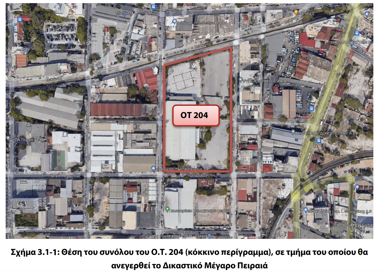 Όπως επισημαίνεται στο φάκελο της ΜΠΕ, το υπό μελέτη έργο βρίσκεται εντός σχεδίου πόλεως στο δήμο Πειραιά «και συγκεκριμένα εντός της ζώνης ανάπλασης στην περιοχή του Αγίου Διονυσίου, περιοχή η οποία είναι ιδανική για την εγκατάσταση της Μητροπολιτικής χρήσης των Δικαστηρίων, με στόχο να αποτελέσει τον κινητήριο μοχλό ανάπτυξης του συνόλου του δήμου».