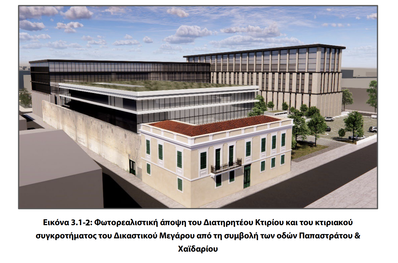 Συνολικά εντός του μεγάρου χωροθετούνται 27 χώροι ακροατηρίων και ολομέλειας με τους αντίστοιχους χώρους αναμονής τους, 24 αίθουσες συσκέψεων δικαστών, 8 χώροι αναμονής μαρτύρων, 2 αίθουσες πολλαπλών χρήσεων, 2 βιβλιοθήκες, 319 γραφεία, γραφεία συνάντησης δικαστών και κατηγορουμένων, χώροι κλιμακίων μεταγωγών και βοηθητικοί χώροι αποθηκών, αρχείων, computer room, κυλικείων, μικρών κουζινών εξυπηρέτησης εργαζομένων, χώροι υγιεινής, με πρόβλεψη για ΑΜΕΑ ανά επίπεδο και ανά τμήμα κτιρίου. Όσον αφορά στο διατηρητέο κτίριο, αυτό θα ανακαινισθεί στην κατάσταση και τη μορφή που είχε, χωρίς καμία αλλαγή, προσθήκη ή μεταβολή στη μορφή και το χαρακτήρα του, για την τοποθέτηση γραφείων δικηγόρων, ώστε να έχουν μεγαλύτερη ιδιωτικότητα, ασφάλεια, αλλά και αισθητική. Παράλληλα, θα αναπλασθεί ο σημερινός υποβαθμισμένος περιβάλλοντας χώρος του διατηρητέου μνημείου, προκειμένου αυτό να αναβαθμιστεί και να αναδειχθεί.