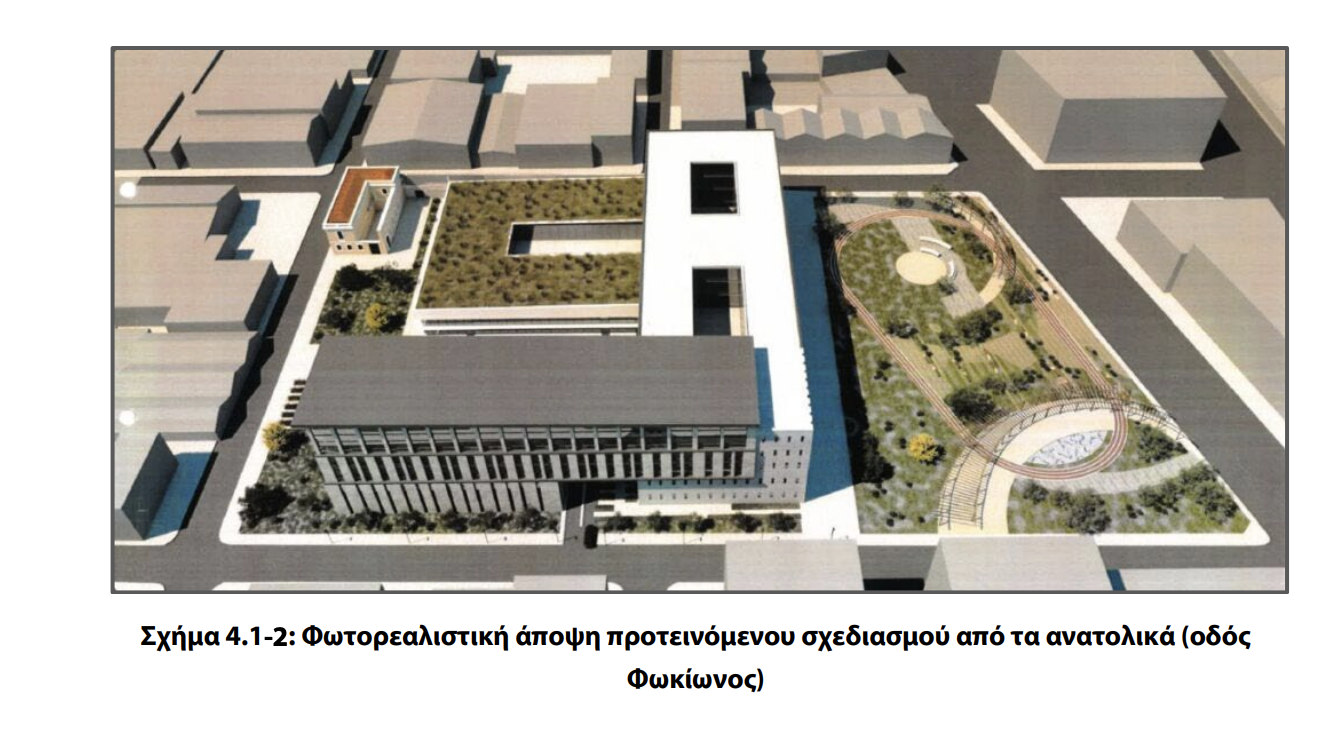 Στον περιβάλλοντα χώρο του κτιριακού συγκροτήματος, συνολικής έκτασης περίπου 6.295 τ.μ., δημιουργούνται, μεταξύ άλλων, περιοχές πρασίνου επιφάνειας 3.300 τ.μ. στο ισόγειο επίπεδο και επιπλέον 200 τ.μ. σε δώμα, για τη διασφάλιση του μικροκλίματος του συγκροτήματος, περιοχές ειδικά διαμορφωμένες με καθιστικά για στάση των χρηστών, που αποτελούν προέκταση των χώρων αναμονής του κτιρίου, περιοχές με υπαίθριες θέσεις στάθμευσης προς την οδό Παπαστράτου, με είσοδο και έξοδο από την οδό Φωκίωνος, χωρητικότητας 62 θέσεων κ.α.. Ο σχεδιασμός και η πρόβλεψη κατασκευής του κτιριακού συγκροτήματος είναι τέτοια ώστε να μπορεί να εξασφαλιστεί η δημιουργία και η λειτουργία αυτού με χαμηλό ενεργειακό αποτύπωμα, ενεργειακής κλάσης Α+ κατ’ ελάχιστο. Ειδικότερα, έχει σχεδιασθεί ώστε να έχει ενεργειακή κατανάλωση τουλάχιστον 20% χαμηλότερη από τα κατώτατα όρια που έχουν οριστεί για την κατασκευή κτιρίων σχεδόν μηδενικής κατανάλωσης ενέργειας (NZEB). Επιπλέον, ακολουθώντας τη μεθοδολογία πιστοποίησης LEED (Leadership in Energy and Environmental Design) του US Green Building Council, η οποία συνδέεται με τις παραμέτρους της ενέργειας, των υλικών, των υδάτινων πόρων, των στερεών αποβλήτων, της οπτικής άνεσης, της υγείας, της κινητικότητας κ.λπ., ο σχεδιασμός του Έργου στοχεύει σε πιστοποίηση LEED σε επίπεδο Gold, ώστε να ανταποκριθεί σε περιβαλλοντικούς, οικονομικούς και κοινωνικούς στόχους βιωσιμότητας.