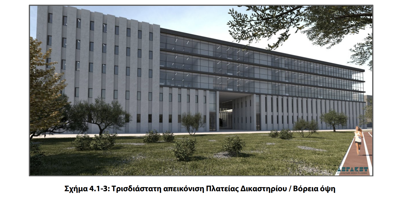 Με βάση το κτιριολογικό πρόγραμμα, οι χώροι χωρίζονται σε δύο μεγάλες ενότητες, (α) τις αίθουσες ακροατηρίων, δικαστών και αναμονής μαρτύρων και (β) τους γραφειακούς χώρους. Το πολυώροφο κτίριο θα αναπτυχθεί σε διάταξη «Π» με βαθμιαία κλιμάκωση των ορόφων, τριγύρω από το διατηρητέο κτίριο. Ο σχηματισμός του συγκροτήματος δημιουργεί έναν εσωτερικό ακάλυπτο χώρο που ενοποιεί τις επί μέρους χρήσεις, ενώ ταυτόχρονα ενισχύει και το αίσθημα της ασφάλειας.