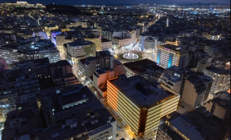 Λίγους μήνες πριν από την ολοκλήρωση του έργου που θα δώσει νέα πνοή στην ευρύτερη περιοχή της Ομόνοιας, το εμβληματικό κτήριο των οδών Πατησίων, Βερανζέρου, Δώρου και Σατωβριάνδου, που «κουβαλά» αναμνήσεις ετών, φωτίστηκε, προσφέροντας λάμψη και χαρά στους κατοίκους και επισκέπτες της πόλης.