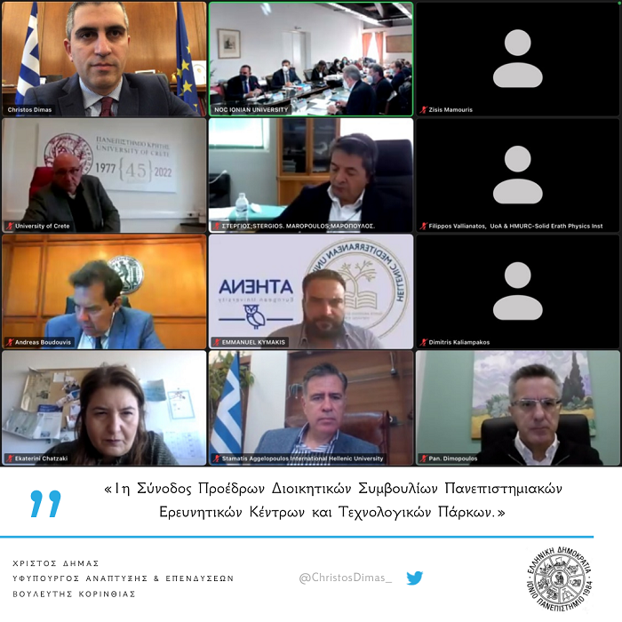 Στις δράσεις της κυβέρνησης για να συνδεθεί πιο αποτελεσματικά η έρευνα και η καινοτομία με την επιχειρηματικότητα αναφέρθηκε ο υφυπουργός Ανάπτυξης και Επενδύσεων, Χρίστος Δήμας, στον χαιρετισμό του κατά τη διάρκεια της σημερινής 1ης Συνόδου Προέδρων Διοικητικών Συμβουλίων Πανεπιστημιακών Ερευνητικών Κέντρων και Τεχνολογικών Πάρκων, που διοργάνωσε το Ιόνιο Πανεπιστήμιο.