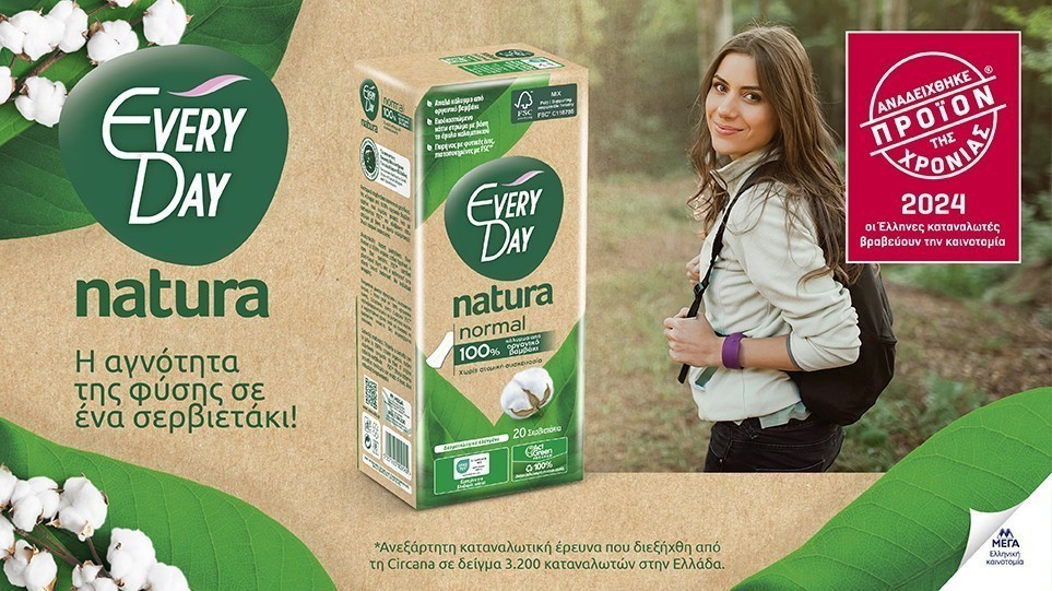 Τα σερβιετάκια EveryDay Natura με κάλυμμα από 100% οργανικό βαμβάκι, εξ ολοκλήρου σχεδιασμό από βιοδιασπώμενα υλικά (απορροφητικός πυρήνας από φυτικές ίνες, αδιάβροχο κάτω κάλυμμα με βάση το άμυλο καλαμποκιού) και 100% ανακυκλώσιμες συσκευασίες, αποτελούν μία ολοκληρωμένη πρόταση υγιεινής που εξασφαλίζει άριστη ισορροπία αποτελεσματικότητας και σεβασμού στο περιβάλλον. Ταυτόχρονα, δίνουν στον καταναλωτή τη δυνατότητα να απολαμβάνει όλα τα οφέλη ενός άριστου προϊόντος ακολουθώντας ορθές περιβαλλοντικές πρακτικές, χωρίς κανέναν συμβιβασμό στην ποιότητα.