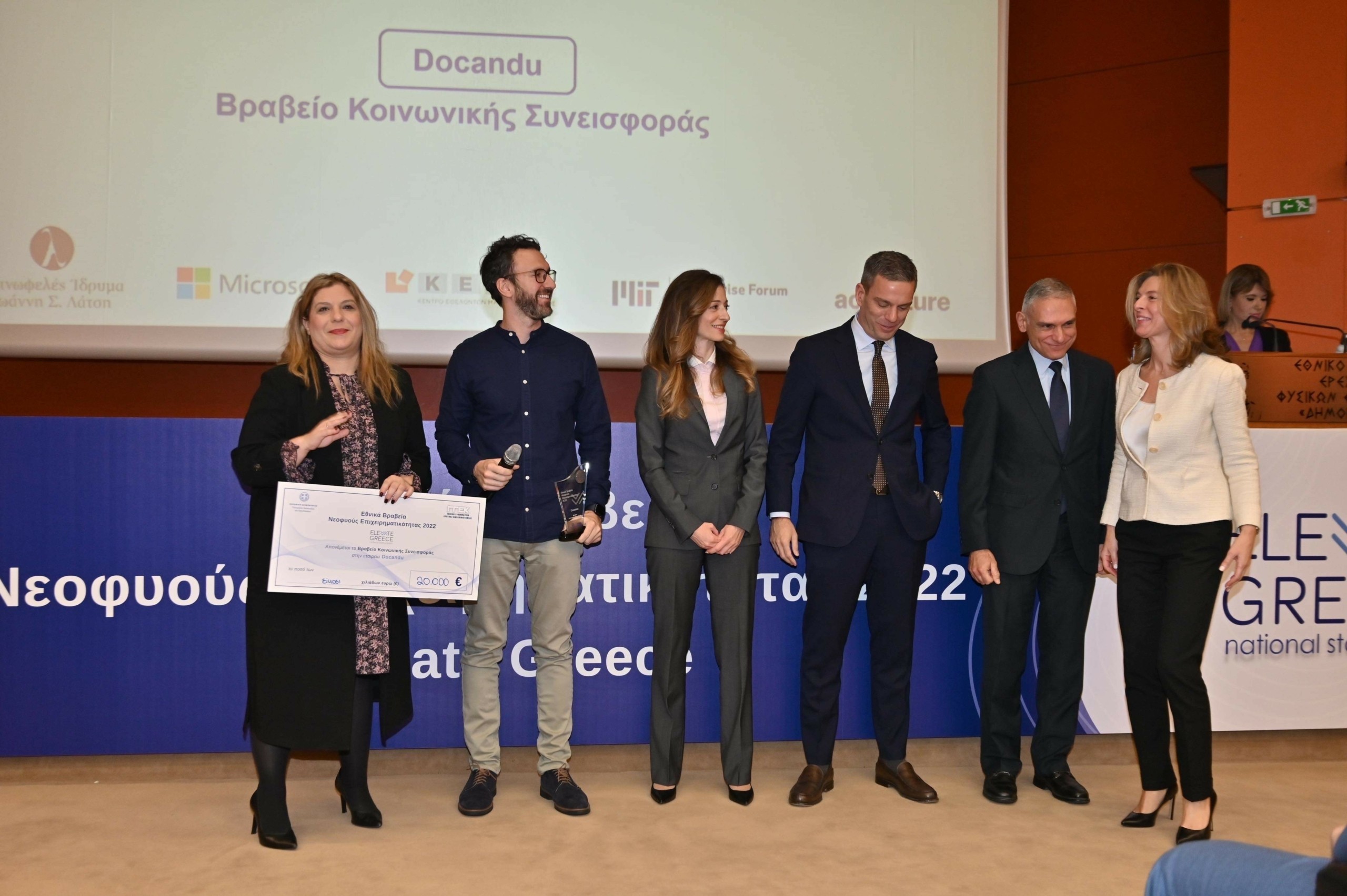 Για την Κοινωνική Συνεισφορά βραβεύτηκε η Docandu, στα Εθνικά Βραβεία Νεοφυών Επιχειρήσεων του Elevate Greece, με το βραβείο να παραλαμβάνει ο ιδρυτής και CEO, Δρ Πέτρος Πανδής, ενώ την απονομή έκανε η υφυπουργός Εργασίας και Κοινωνικών Υποθέσεων, αρμόδια για θέματα Δημογραφικής Πολιτικής και Οικογένειας, Μαρία Συρεγγέλα.