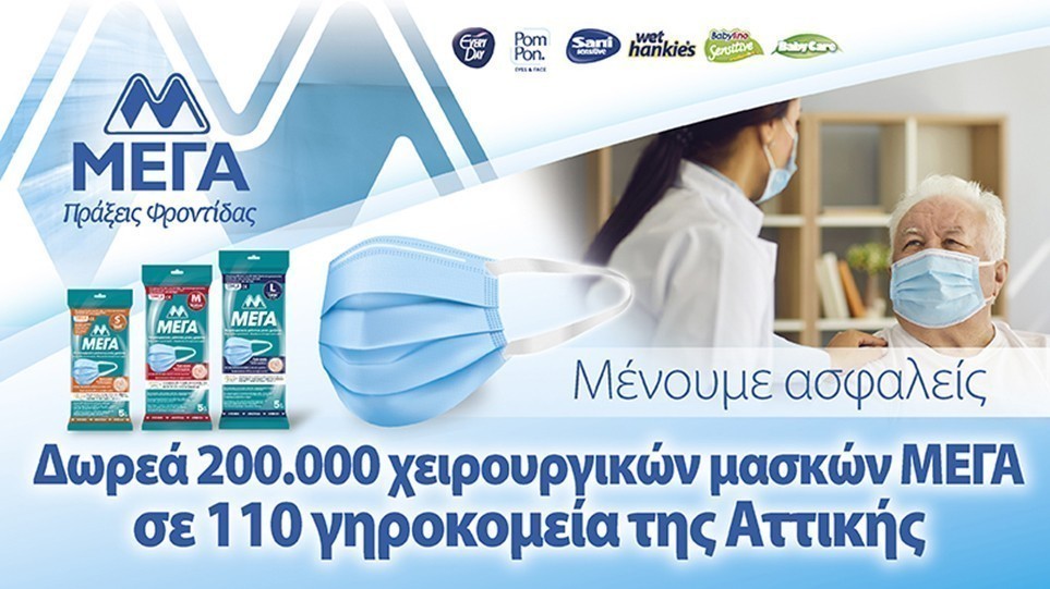 Η ελληνική εταιρεία προϊόντων προσωπικής υγιεινής ΜΕΓΑ ΠΡΟΙΟΝΤΑ ΑΤΟΜΙΚΗΣ ΥΓΙΕΙΝΗΣ Α.Ε., με αίσθημα ευθύνης διέθεσε δωρεάν 200.000 χειρουργικές μάσκες ΜΕΓΑ, σε πάνω από 110 γηροκομεία της Αττικής, στο πλαίσιο της ενίσχυσης των μέτρων προστασίας έναντι της διασποράς του κορωνοϊού.