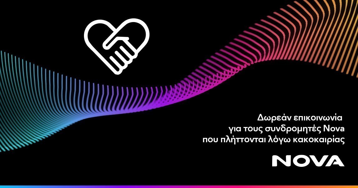 Η Nova, μέλος της United Group, του κορυφαίου παρόχου τηλεπικοινωνιών και media στη Νοτιοανατολική Ευρώπη, κατανοώντας τις αυξημένες ανάγκες επικοινωνίας στις περιοχές που έχουν πληγεί από τα ακραία καιρικά φαινόμενα των τελευταίων ημερών, ενημερώνει τους συνδρομητές της ότι βρίσκεται κοντά τους με δωρεάν υπηρεσίες επικοινωνίας.
