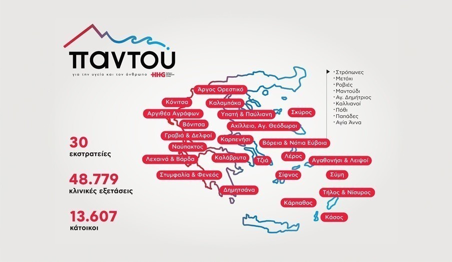 Μέχρι σήμερα, έχουν πραγματοποιηθεί 30 εθελοντικές εκστρατείες, έχουν εξεταστεί περισσότεροι από 13.607 κάτοικοι και έχουν διενεργηθεί περισσότερες από 48.779 ιατρικές και διαγνωστικές εξετάσεις στις ακόλουθες περιοχές: Λειψοί-Αγαθονήσι, Αχίλλειο-Άγιοι Θεόδωροι, Ναύπακτος, Λεχαινά-Βάρδα, Παπάδες-Αγία Άννα Ευβοίας, Γραβιά-Δελφοί, Ροβιές-Μαντούδι Ευβοίας, Δημητσάνα Αρκαδίας, Υπάτη-Παύλιανη, Κόνιτσα, Τζια, Άγιος Δημήτριος-Πόθι Ευβοίας, Στυμφαλία-Φενεός Ορεινής Κορινθίας, Στρόπονες-Μετόχι Ευβοίας, Σκύρος, Καρπενήσι, Κάρπαθος, Καλάβρυτα, Καλαμπάκα, Λέρος, Τήλος, Νίσυρος, Άργος Ορεστικό, Σύμη, Αργιθέα Αγράφων, Κάσος, Αστυπάλαια, Σίφνος και Βόνιτσα. Ταυτόχρονα, ο Όμιλος HHG υποστηρίζει τα Κέντρα Υγείας και τα Ιατρεία με ιατρικό εξοπλισμό, καθώς και με φαρμακευτικό και υγειονομικό υλικό. Οι εκστρατείες υγείας οργανώνονται πάντα σε συνεργασία με την τοπική αυτοδιοίκηση της εκάστοτε περιοχής.