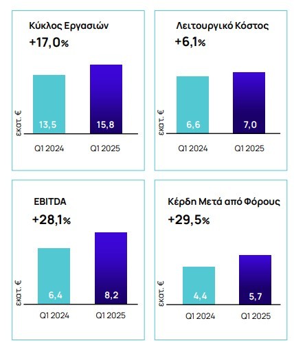 • Αύξηση κύκλου εργασιών κατά 17,0% σε σχέση με το πρώτο τρίμηνο 2024.