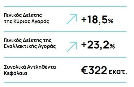 • Τα συνολικά αντληθέντα κεφάλαια ανήλθαν στα €322 εκατ., εκ των οποίων €211 εκατ. από αυξήσεις μετοχικού κεφαλαίου (ΑΜΚ) και €110 εκατ. από νέες εισαγωγές (IPOs).