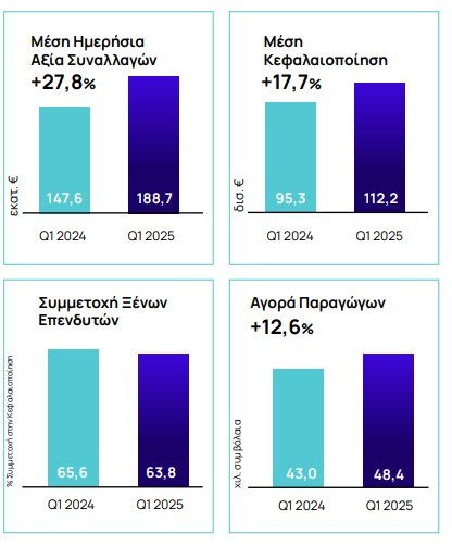 • Η μέση Κεφαλαιοποίηση της αγοράς αυξήθηκε κατά 17,7% σε σύγκριση με την αντίστοιχη μέση Κεφαλαιοποίηση του πρώτου τριμήνου 2024 (€112,2 δισ. έναντι €95,3 δισ.).