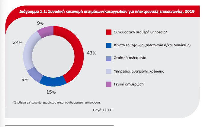 Ενδεικτικά στην κινητή τηλεφωνία τα αιτήματα/ καταγγελίες ήταν σε ποσοστό 70% η αμφισβήτηση χρεώσεων λογαριασμού, στην σταθερή σε ποσοστό 46%, ενώ στην συνδυαστική σταθερή υπηρεσία (σταθερή τηλεφωνία, διαδίκτυο ή/και συνδρομητική τηλεόραση) το αντίστοιχο ποσοστό ήτα στο 37% και ακολουθούν οι καταγγελίες για μη αποκατάσταση βλάβης.