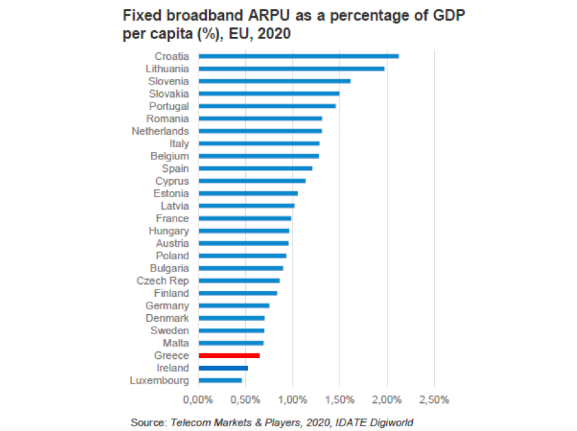 • Η Ελλάδα έχει το τρίτο χαμηλότερο μέσο έσοδο ανά χρήστη ως ποσοστό του κατά κεφαλήν ΑΕΠ σε μηνιαία βάση μεταξύ των 27 χωρών της Ευρωπαϊκής Ένωσης.