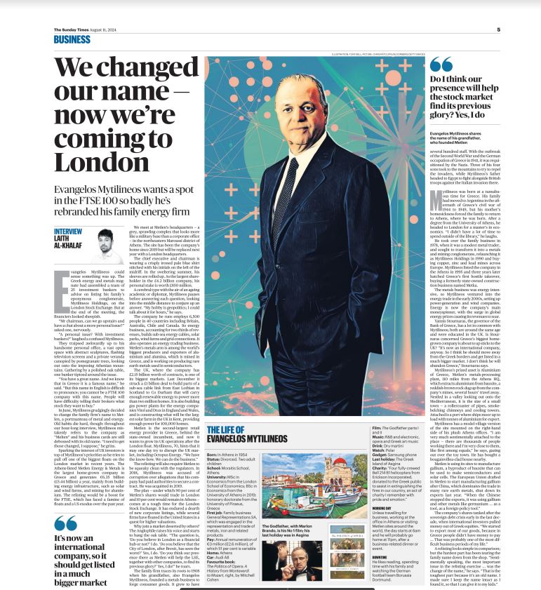 Στο σχέδιο εισόδου στο Χρηματιστήριο του Λονδίνου (LSE), την αλλαγή επωνυμίας του Ομίλου σε METLEN αλλά και στα μελλοντικά σχέδια αναφέρθηκε ο Ευάγγελος Μυτιληναίος σε παρουσίαση που πραγματοποίησαν οι Sunday Times (Δείτε ΕΔΩ το δημοσίευμα)