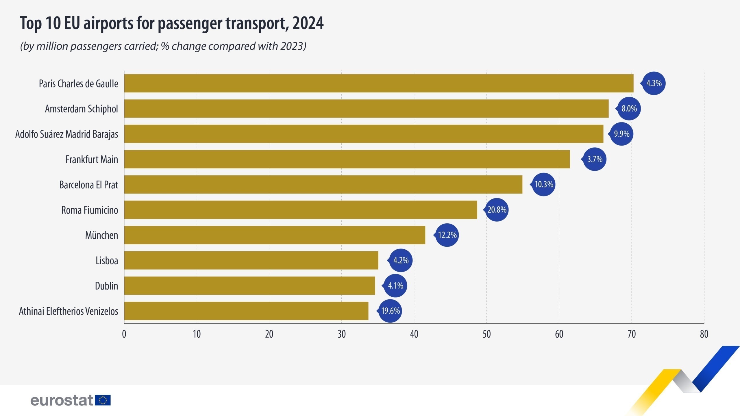 Το 2024, ανάμεσα στα δέκα αεροδρόμια της ΕΕ με τη μεγαλύτερη επιβατική κίνηση, πρώτο παρέμεινε το Παρίσι/Σαρλ ντε Γκωλ με 70,3 εκατ. επιβάτες (+4,3%), ακολουθούμενο από το Άμστερνταμ/Σιπόλ με 66,8 εκατ. (+8,0%), το Μαδρίτη/Μπαράχας με 66,1 εκατ. (+9,9%), το Φρανκφούρτη/Μάιν με 61,5 εκατ. (+3,7%) και το Βαρκελώνη/Ελ Πρατ με 54,9 εκατ. (+10,3%).