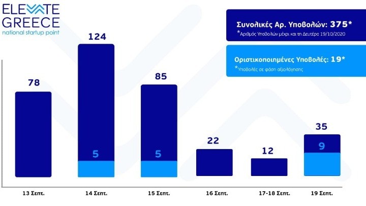 Τις πρώτες 6 ημέρες λειτουργίας του ElevateGreece ο συνολικός αριθμός υποβολών έφτασε τις 394 νεοφυείς επιχειρήσεις που αιτήθηκαν να εγγραφούν στο μητρώο.