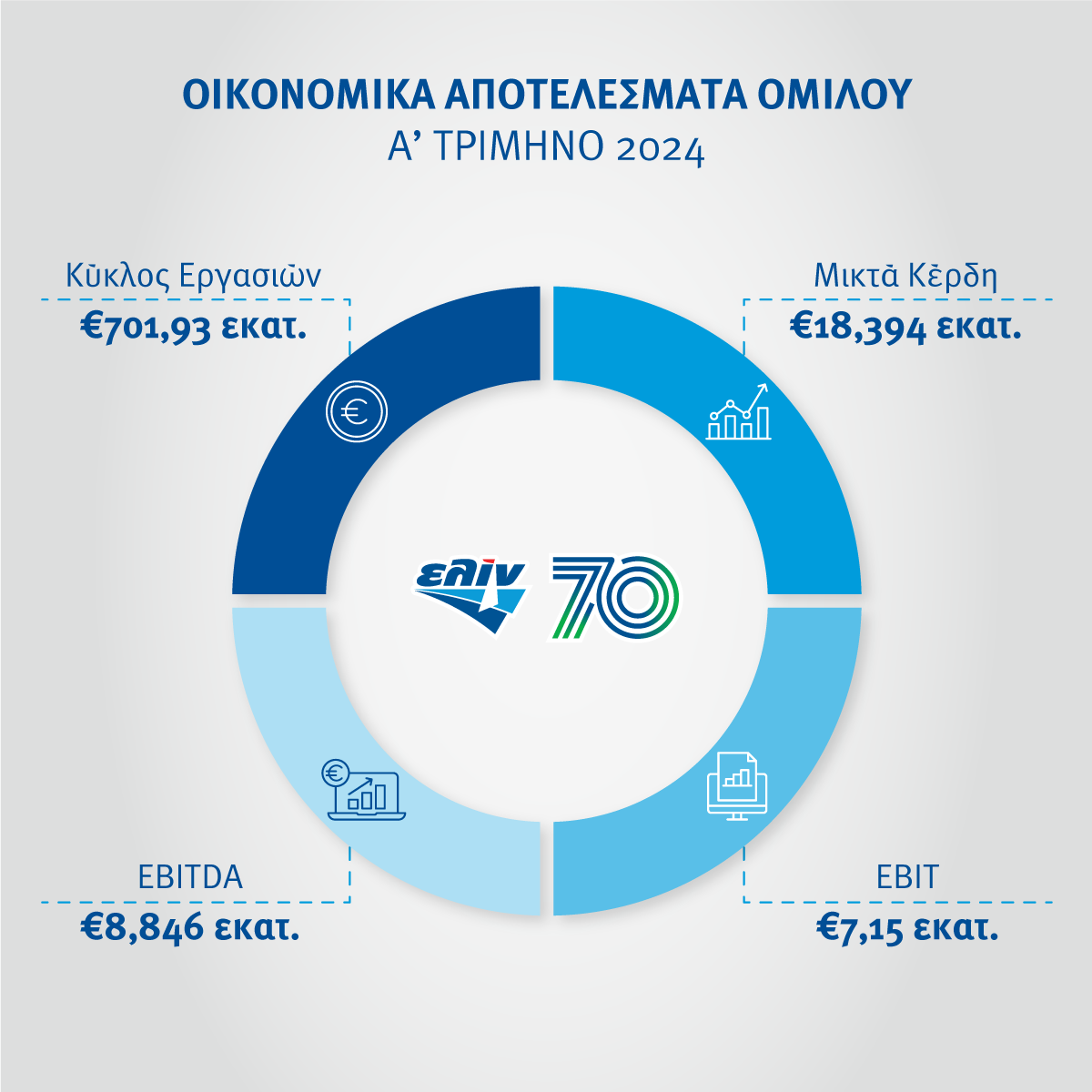 Ο Κύκλος Εργασιών του Ομίλου, μετά τις διεταιρικές απαλοιφές, ανήλθε σε € 702 εκατ. το α΄ τρίμηνο του 2024 σε σύγκριση με € 604,6 εκ. την αντίστοιχη περίοδο του 2023 σημειώνοντας αύξηση κατά 16,09%, ως αποτέλεσμα των αυξημένων πωλήσεων του τομέα του Διεθνούς Εμπορίου.
