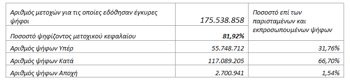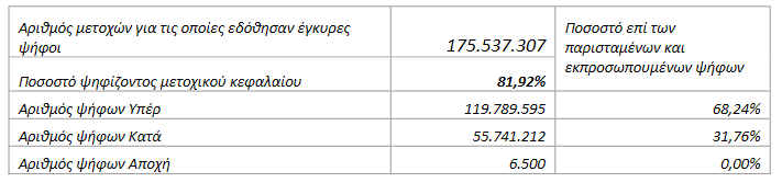 Η Έκτακτη Γενική Συνέλευση κατόπιν νόμιμης ψηφοφορίας και με απόλυτη πλειοψηφία (βλ. αναλυτικά κατωτέρω), λαμβάνει τις ακόλουθες αποφάσεις: