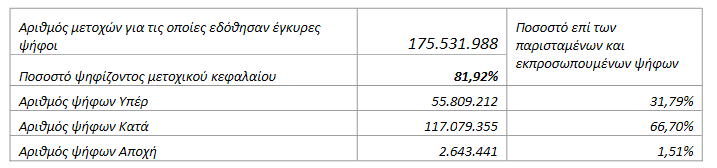 Συμμετείχαν 189 μέτοχοι που εκπροσωπούν 175.666.654 κοινές ονομαστικές μετοχές (και 175.666.654 δικαιώματα ψήφου) επί συνόλου 214.272.003 κοινών ονομαστικών μετοχών (και 214.272.003 δικαιωμάτων ψήφου), ήτοι ποσοστό 81,98% του καταβεβλημένου μετοχικού κεφαλαίου.