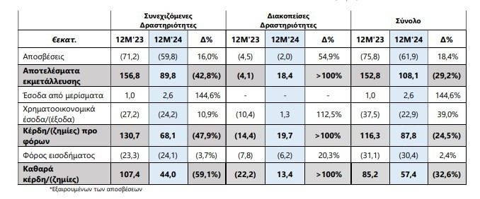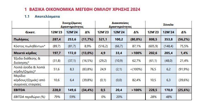 – Κέρδη προ Φόρων Τόκων και Αποσβέσεων (EBITDA) €170 εκατ. (Σ.Δ. €149,6 εκατ.) έναντι €228,5 εκατ. το 2023, μείωση 26%, με περιθώριο EBITDA 48% (Σ.Δ περιθώριο EBITDA 59%).