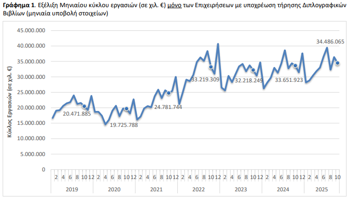 Για το σύνολο των επιχειρήσεων της οικονομίας με υποχρέωση τήρησης διπλογραφικών βιβλίων, για τις οποίες υπάρχουν διαθέσιμα στοιχεία σε μηνιαία βάση, ο κύκλος εργασιών τον Οκτώβριο 2025 ανήλθε σε 34.486.065 χιλ. ευρώ, σημειώνοντας αύξηση 2,5% σε σχέση με τον Οκτώβριο 2024, που είχε ανέλθει σε 33.651.923 χιλ. ευρώ.