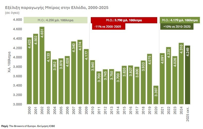Τα στοιχεία της μελέτης δείχνουν ότι την περίοδο 2010-2020 η μέση παραγωγή μπύρας στην Ελλάδα ήταν μειωμένη κατά περίπου 11% σε σχέση με τη δεκαετία του 2000. Η εικόνα αυτή άρχισε να αντιστρέφεται μετά το 2021, με την επανεκκίνηση της οικονομίας και την ισχυρή ανάκαμψη του τουρισμού, οδηγώντας σε αύξηση της παραγωγής κατά περίπου 10% σε σχέση με την προηγούμενη δεκαετία. Το 2024, η παραγωγή προσεγγίζει πλέον τα επίπεδα του 2008, σηματοδοτώντας την ολοκλήρωση ενός μακρού κύκλου προσαρμογής.