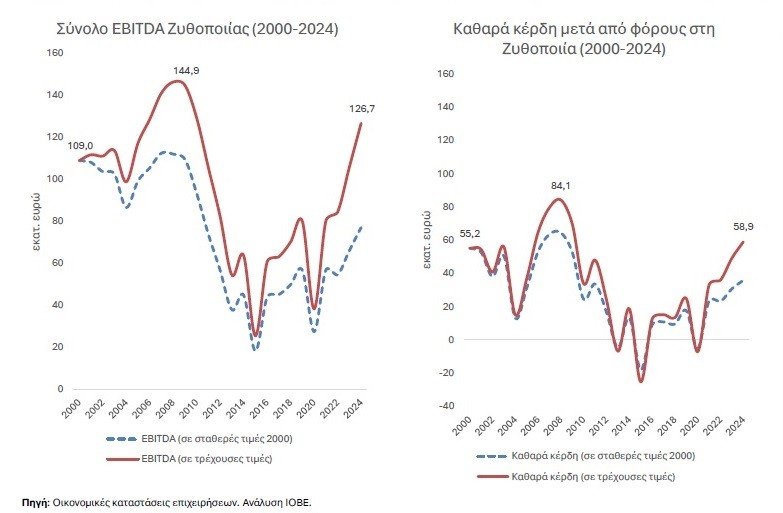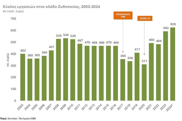 Χρειάστηκαν σχεδόν δύο δεκαετίες για να επιστρέψει η ελληνική ζυθοποιία εκεί όπου βρισκόταν πριν από την οικονομική κρίση. Το 2024, ο κλάδος πλησίασε ξανά τα επίπεδα παραγωγής και κατανάλωσης του 2008, με τον κύκλο εργασιών να φτάνει τα 626 εκατ. ευρώ, αλλά και την κερδοφορία να ανακάμπτει μετά από μια δεκαετία έντονων πιέσεων, χωρίς ωστόσο να έχει επιστρέψει στα επίπεδα της προ κρίσης περιόδου.