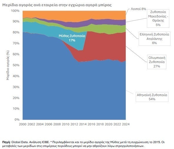Η Αθηναϊκή Ζυθοποιία παραμένει ηγέτης με περίπου 54%, ενώ η Ολυμπιακή Ζυθοποιία ακολουθεί με περίπου 27%. Οι δύο μεγαλύτεροι παίκτες εξακολουθούν να συγκεντρώνουν τη μερίδα του λέοντος της αγοράς, αν και το συνολικό τους μερίδιο έχει υποχωρήσει από περίπου 93% το 2000 σε περίπου 81% το 2024.