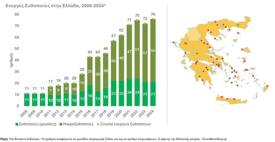 Η εξέλιξη αυτή αποτυπώνεται και στον αριθμό των παραγωγικών μονάδων, οι οποίες έφτασαν τις 76 το 2024 από μόλις 11 το 2008, κυρίως λόγω της ανάπτυξης της μικροζυθοποιίας και της ενίσχυσης τοπικών παραγωγών σε όλη τη χώρα.