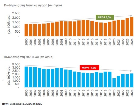 Παρά τη σημαντική αυτή μετατόπιση, η Ελλάδα εξακολουθεί να διατηρεί υψηλή εξάρτηση από την HORECA σε σχέση με άλλες ευρωπαϊκές αγορές, όπου η λιανική κυριαρχεί. Ο τουρισμός εξακολουθεί να λειτουργεί ως βασικός μοχλός ζήτησης, διατηρώντας την επιτόπια κατανάλωση σε υψηλά επίπεδα.