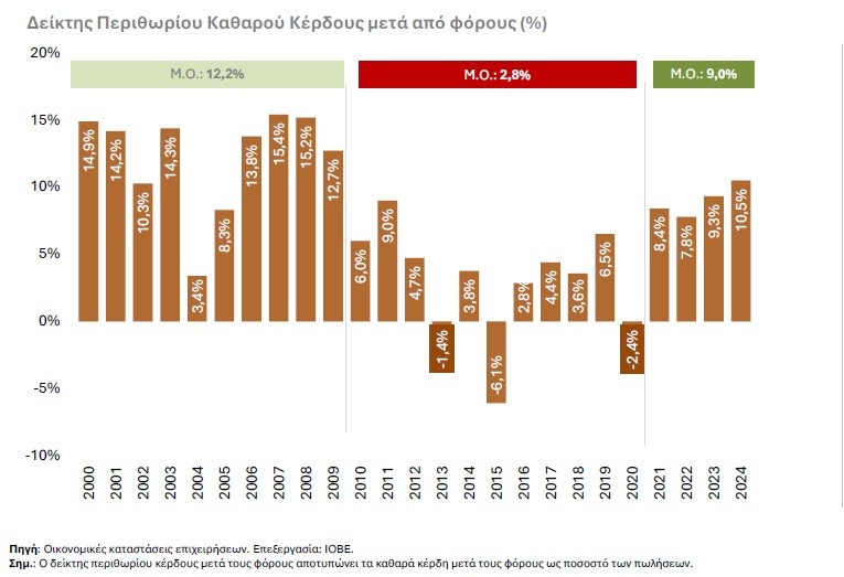 Τα στοιχεία της μελέτης δείχνουν ότι τα περιθώρια καθαρού κέρδους, αν και έχουν ανακάμψει μετά το 2021, διαμορφώνονται σήμερα κοντά στο 9%, σημαντικά χαμηλότερα από τα επίπεδα της προ κρίσης περιόδου, όταν κινούνταν μεταξύ 13% και 15%. Με άλλα λόγια, ο κλάδος εξακολουθεί να «χάνει» περίπου 4-5 ποσοστιαίες μονάδες κερδοφορίας σε σχέση με το παρελθόν.