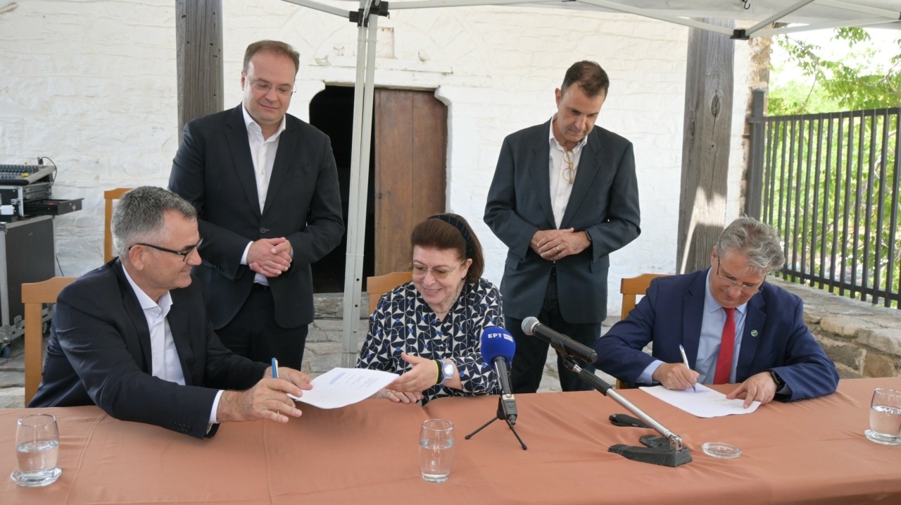 Σύμβαση δωρεάς για την υλοποίηση του έργου «Εκτέλεση εργασιών στερέωσης και πυροπροστασίας του συγκροτήματος Πύργου Προσφορίου Ουρανούπολης» υπέγραψαν η Υπουργός Πολιτισμού Λίνα Μενδώνη και ο Πρόεδρος της «Ελληνικός Χρυσός Α.Ε.», Χρήστος Μπαλάσκας, παρουσία του Δημάρχου Αριστοτέλη Στέλιου Βαλιάνου.
