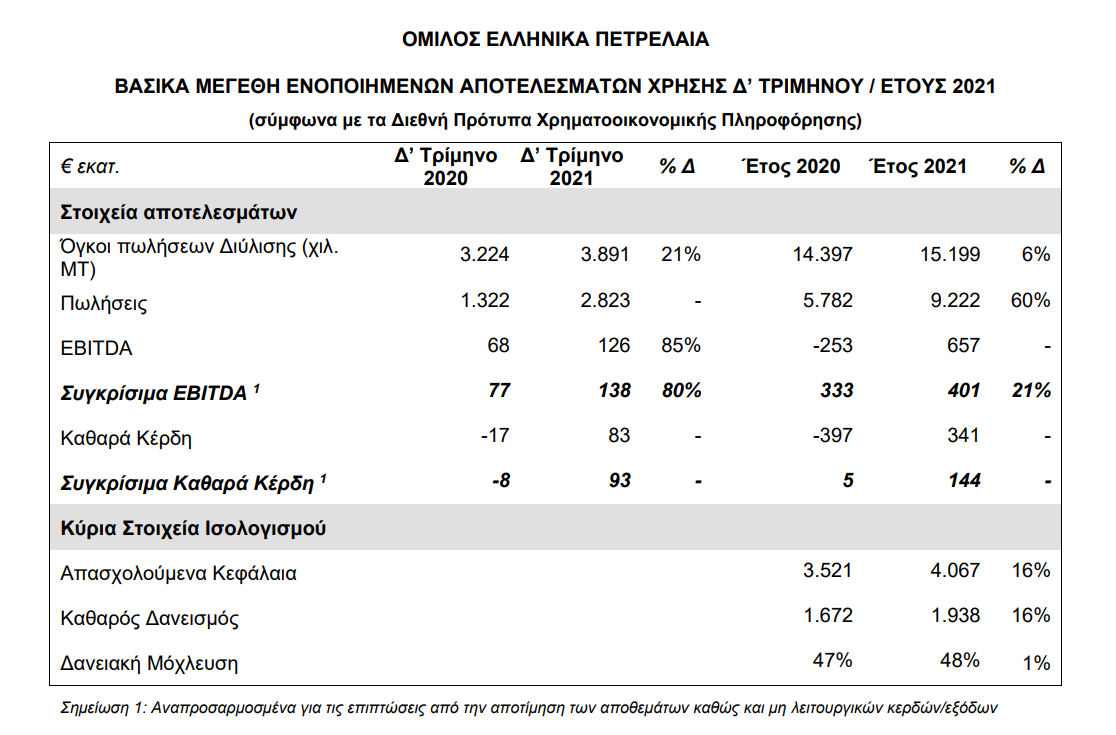 Η ΕΛΛΗΝΙΚΑ ΠΕΤΡΕΛΑΙΑ ανακοίνωσε τα ενοποιημένα οικονομικά αποτελέσματα Δ’ Τριμήνου και Έτους 2021, με τα Συγκρίσιμα Κέρδη EBITDA να ανέρχονται στα €138 εκατ. στο Δ’ Τρίμηνο, αυξημένα κατά 80% σε σχέση με πέρυσι. Αντίστοιχα, τα ετήσια Συγκρίσιμα Κέρδη EBITDA ανήλθαν σε €401 εκατ. (+21%) και τα Συγκρίσιμα Καθαρά Κέρδη διαμορφώθηκαν στα €144 εκατ..